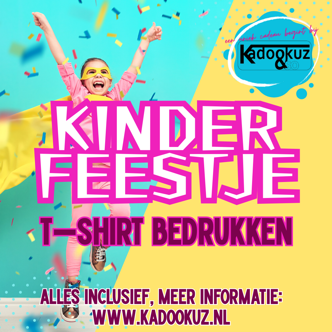 Ben je op zoek naar een creatief en compleet kinderfeestje? Bij ons gaan de kinderen aan de slag met hun eigen T-shirt, maken we een leuke mini fotoshoot, en sluiten we af met frietjes en een snack. Alles is inbegrepen: onbeperkt ranja, wat lekkers tussendoor Γ©n een gepersonaliseerde mok voor de jarige als extra cadeautje.