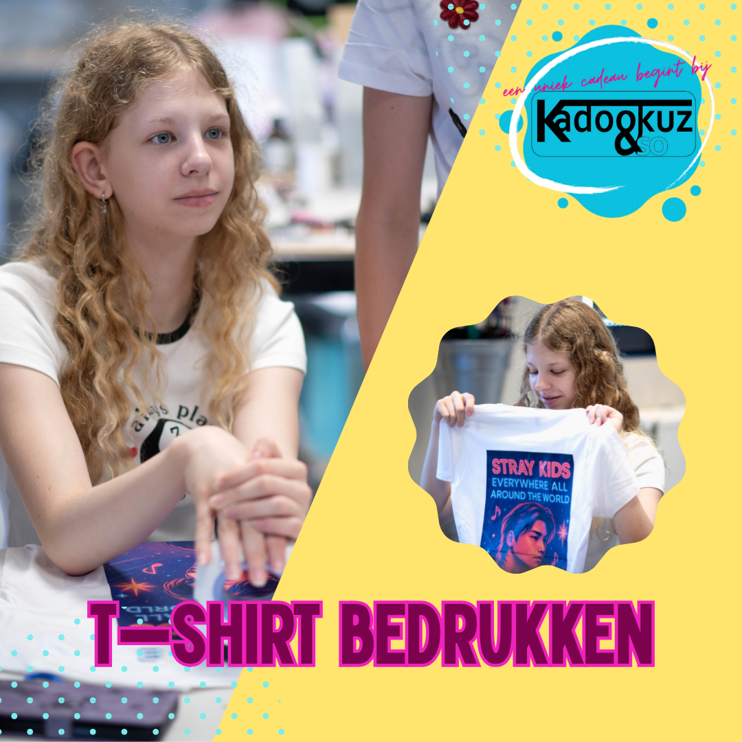Vooraf mogen jullie een afbeelding of tekst doorgeven en de maten opgeven. Tijdens het feestje gaan de kinderen onder begeleiding aan de slag en ontwerpen ze hun unieke shirt dat ze natuurlijk mee naar huis nemen.