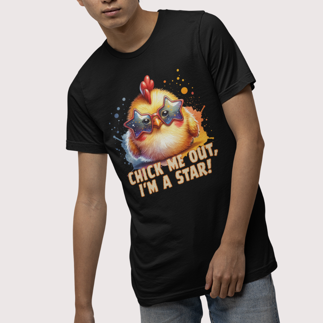Chick me out, I’m a star! Dit T-shirt is voor echte eyecatchers met humor. Met een vrolijke kuikentekening en knallende kleuren.