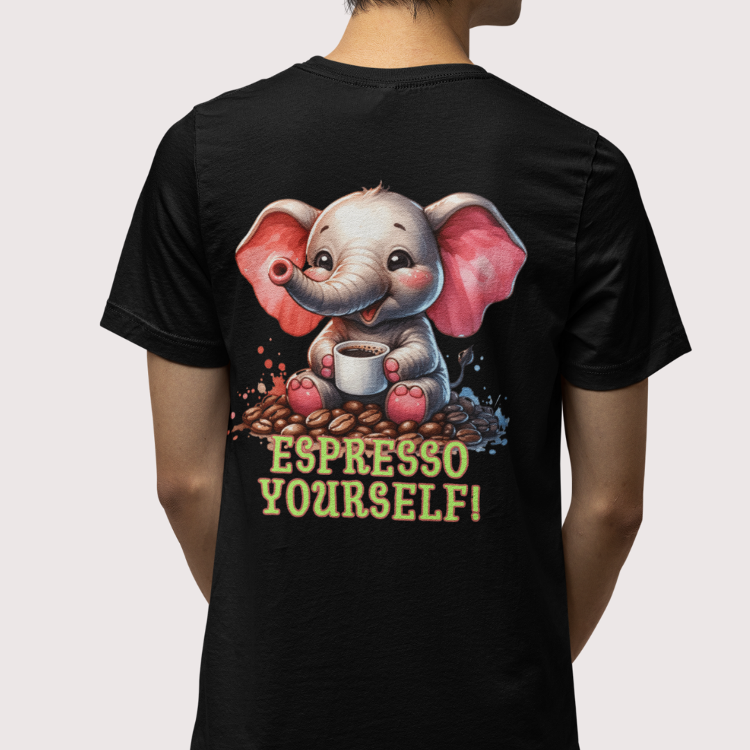 Espresso Yourself! Dit schattige T-shirt met koffiedrinkend olifantje is dé match voor elke koffieliefhebber met gevoel voor humor.