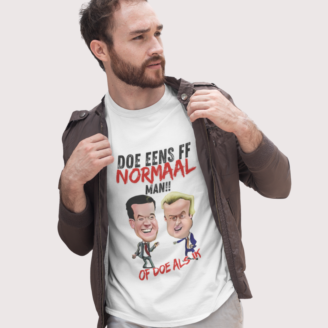 Doe eens ff normaal man! Of doe alsof – dit T-shirt met humoristische karikaturen is een knipoog naar bekende uitspraken en politieke types.