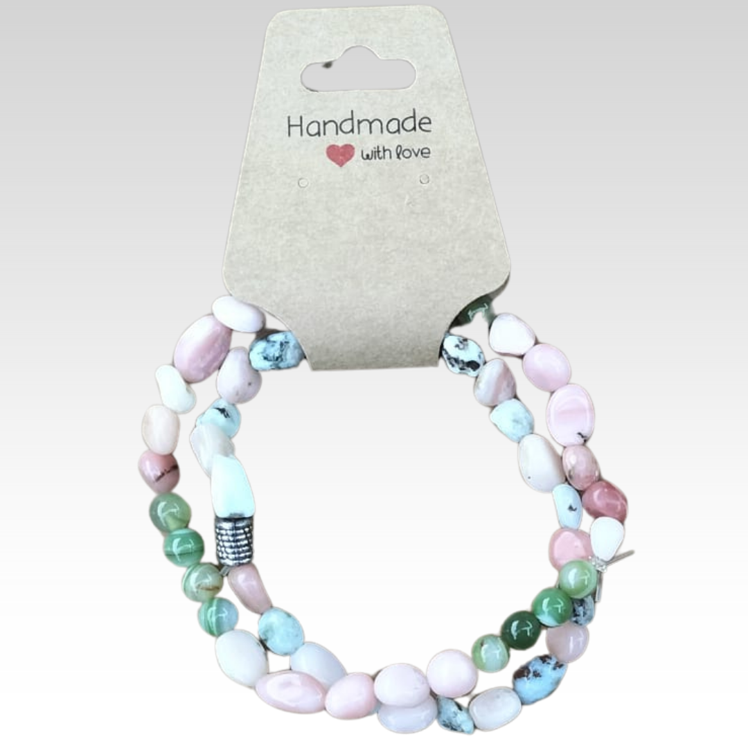 Deze handgemaakte armbandenset is een echte eyecatcher! Elke armband is zorgvuldig samengesteld met een mix van natuursteen kralen, aangevuld met hoogwaardige metalen en accentkralen. Door de combinatie van kleuren en materialen straalt elke set karakter en creativiteit uit.