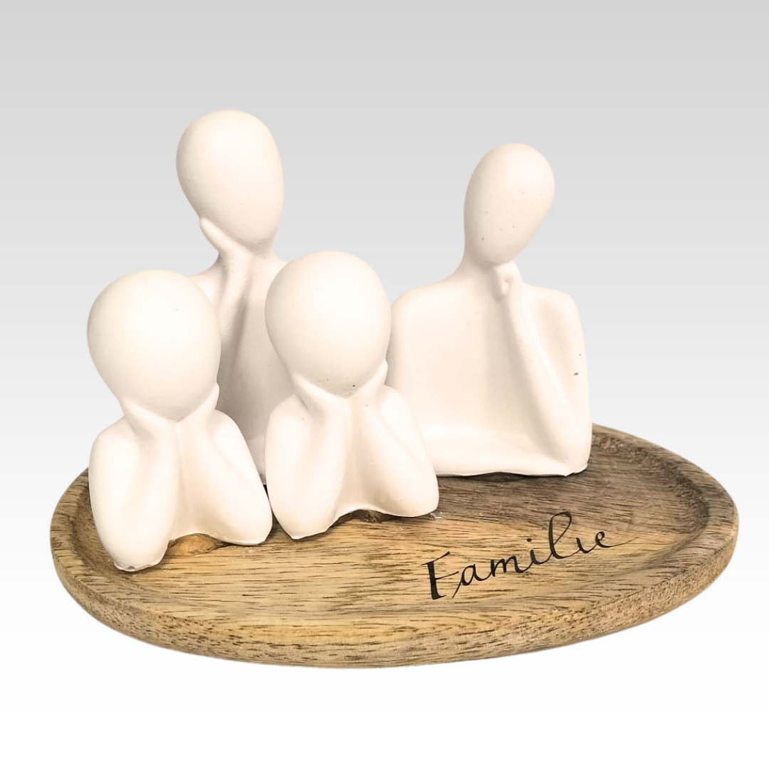 Een subtiel en stijlvol symbool van verbondenheid. Dit kunstzinnig vormgegeven beeldje toont vier gestileerde figuren op een houten ondergrond met het woord "Familie" erin geschreven.
