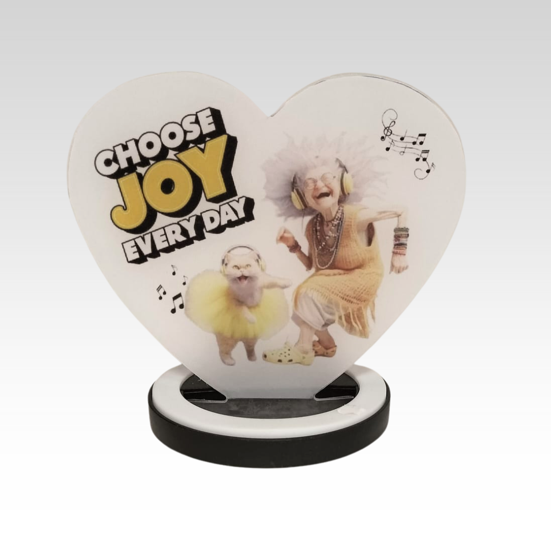 Een dagelijkse glimlach gegarandeerd! Dit handgemaakte LED-lampje met de tekst "Choose Joy Every Day" en een vrolijke print brengt instant good vibes in huis. De oplaadbare LED-ring zorgt voor zacht, sfeervol licht – perfect voor op je nachtkastje, bureau of in de woonkamer.
