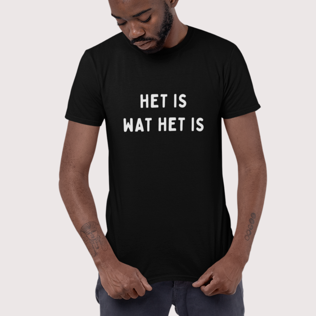 Het is wat het is – een simpel, krachtig T-shirt voor wie het leven neemt zoals het komt.