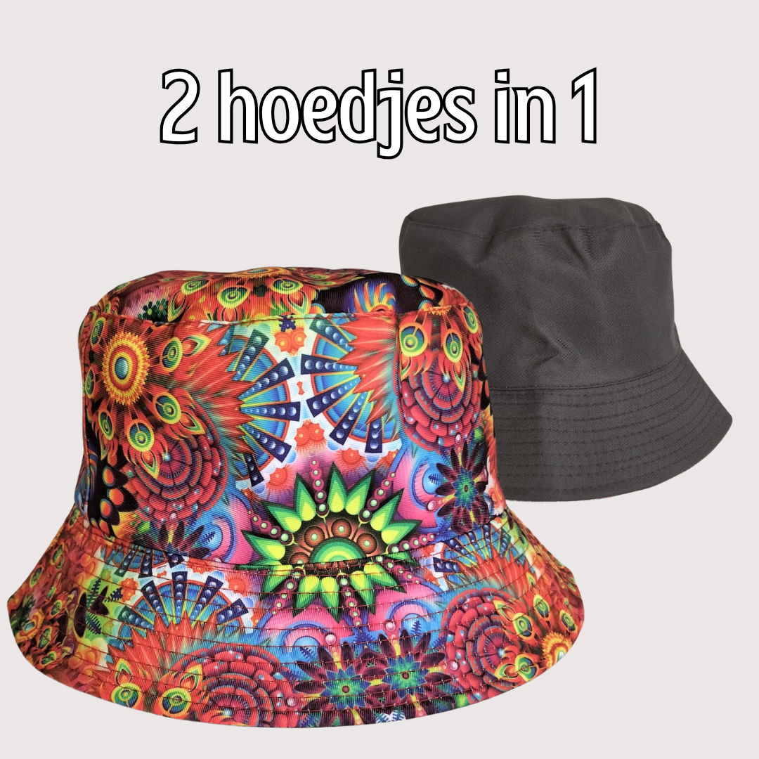 Deze omkeerbare bucket hat is perfect voor iedereen die graag afwisselt. De ene kant is een echte blikvanger met een kleurrijke, speelse print vol zon, patronen en vrolijke vibes – ideaal voor festivals, vakanties of een zonnige dag in eigen stijl. Draai je 'm om? Dan heb je ineens een rustige, basic grijze hoed die bij elke outfit past.