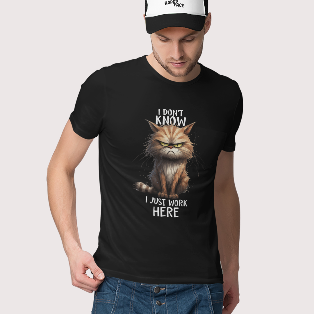 I don’t know, I just work here – dit T-shirt met chagrijnige kat zegt precies wat jij denkt op je werk. Hilarisch en herkenbaar