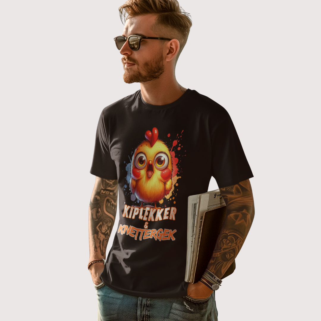 Kiplekker & knettergek – dit T-shirt met vrolijk kuiken zegt het allemaal: een mix van goed humeur en gezonde gekte.