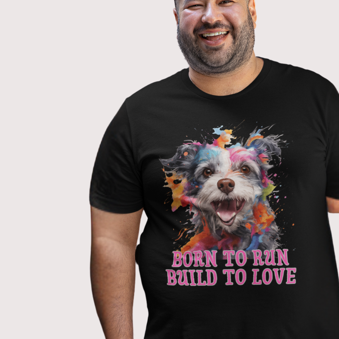 Vrolijk, kleurrijk en een tikkeltje rebels! Dit T-shirt met hondenprint en de tekst "Born to run, built to love" is een ode aan energie en trouw.
