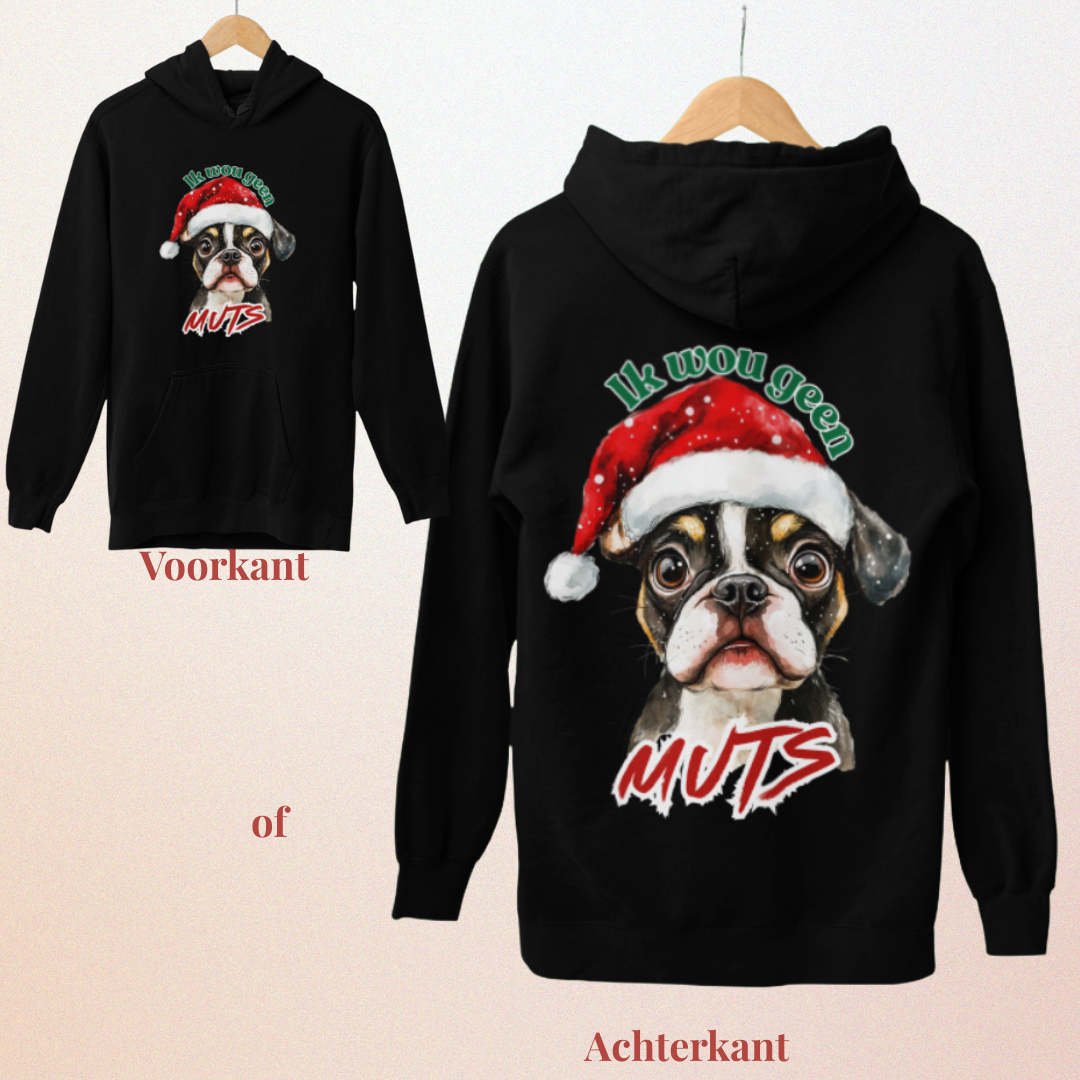 Lekker warm en heerlijk fout! Met de chagrijnige hond en de tekst “Ik wilde geen muts” is dit dé hoodie voor wie kerst viert met een flinke dosis humor.