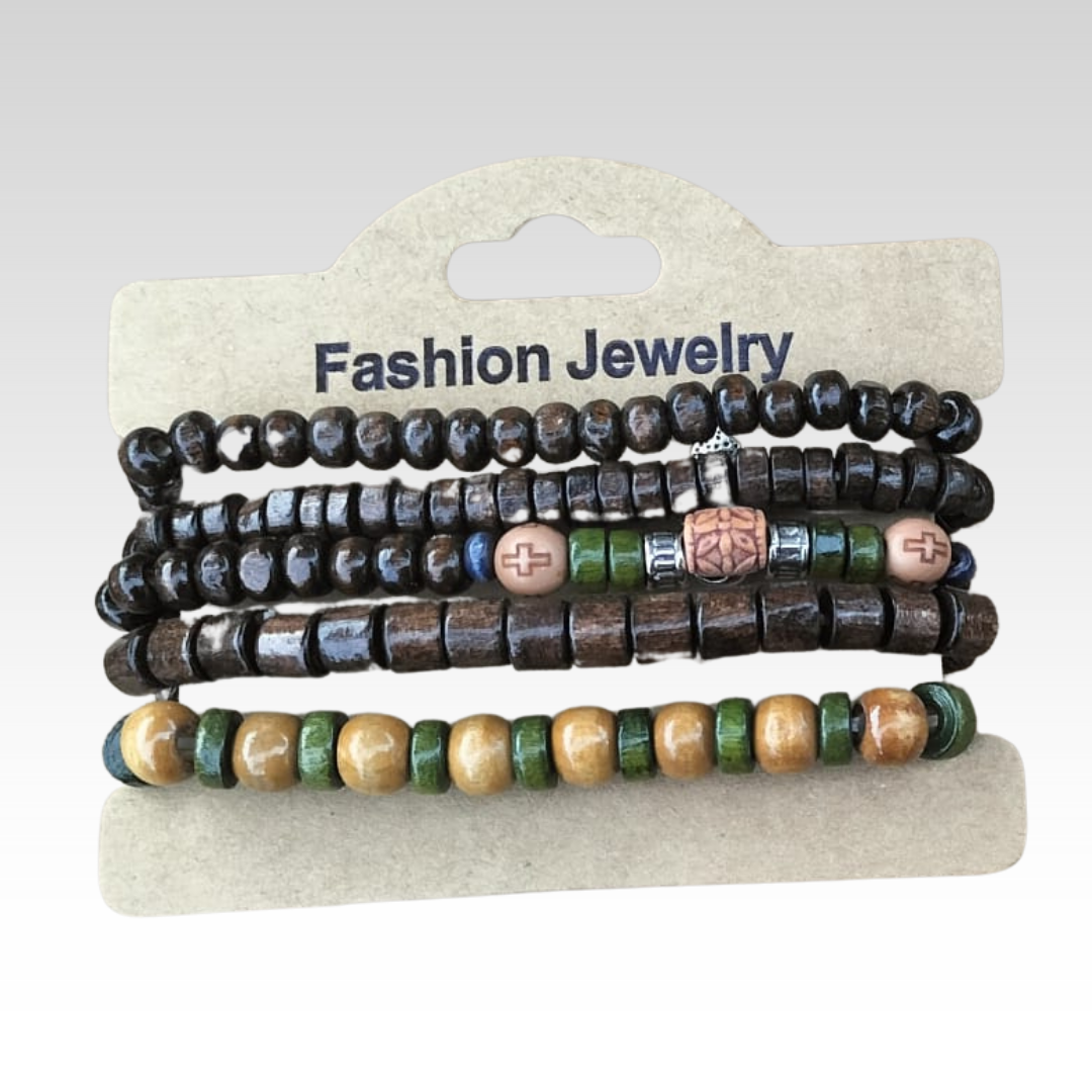 Met deze stijlvolle set van vijf houten armbanden geef je elke outfit een natuurlijke touch. De elastische band zorgt voor een comfortabele pasvorm om vrijwel elke pols. De warme kleuren variëren van wit en bruin tot zwart en oker, waardoor je ze perfect samen kunt dragen of apart kunt combineren.