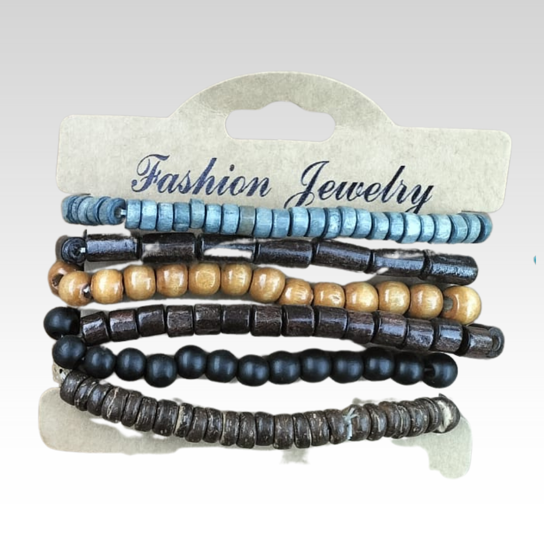 Met deze stijlvolle set van vijf houten armbanden geef je elke outfit een natuurlijke touch. De elastische band zorgt voor een comfortabele pasvorm om vrijwel elke pols. De warme kleuren variëren van wit en bruin tot zwart en oker, waardoor je ze perfect samen kunt dragen of apart kunt combineren.
