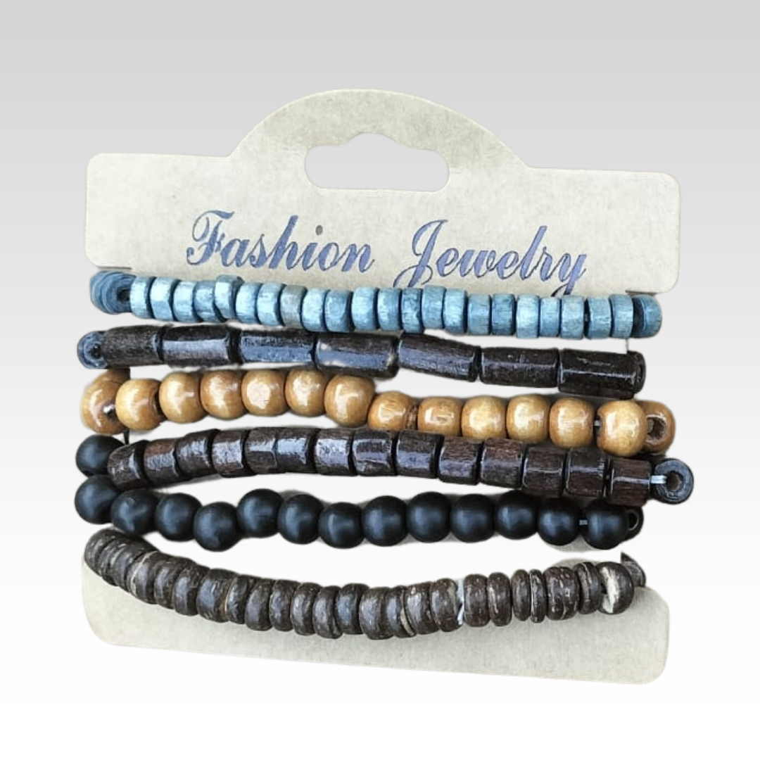 Met deze stijlvolle set van vijf houten armbanden geef je elke outfit een natuurlijke touch. De elastische band zorgt voor een comfortabele pasvorm om vrijwel elke pols. De warme kleuren variëren van wit en bruin tot zwart en oker, waardoor je ze perfect samen kunt dragen of apart kunt combineren.