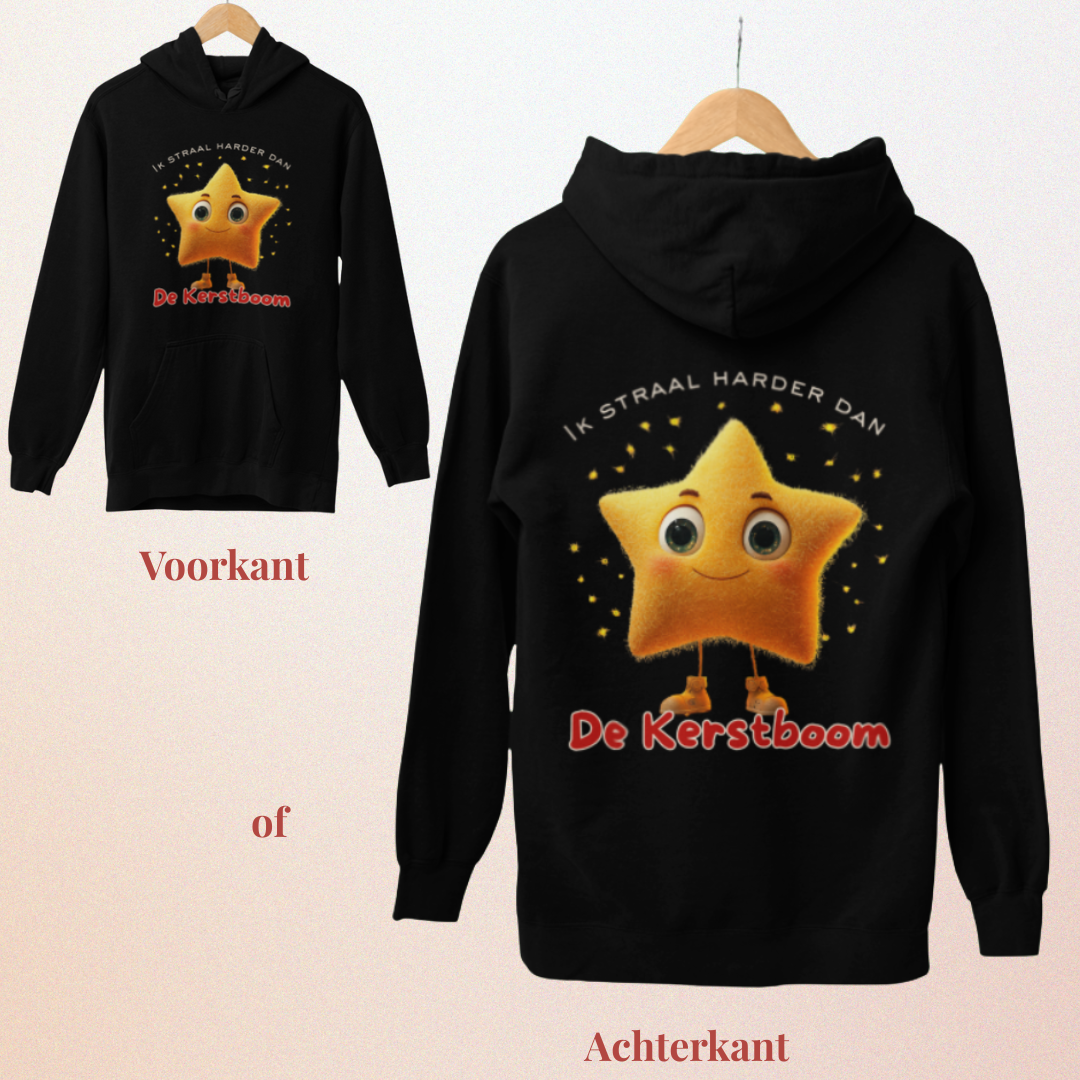 Met deze hoodie ben jij het echte stralende middelpunt van de feestdagen. De vrolijke ster en de tekst “Ik straal harder dan de kerstboom” maken dit de perfecte combinatie van cozy en hilarisch fout.