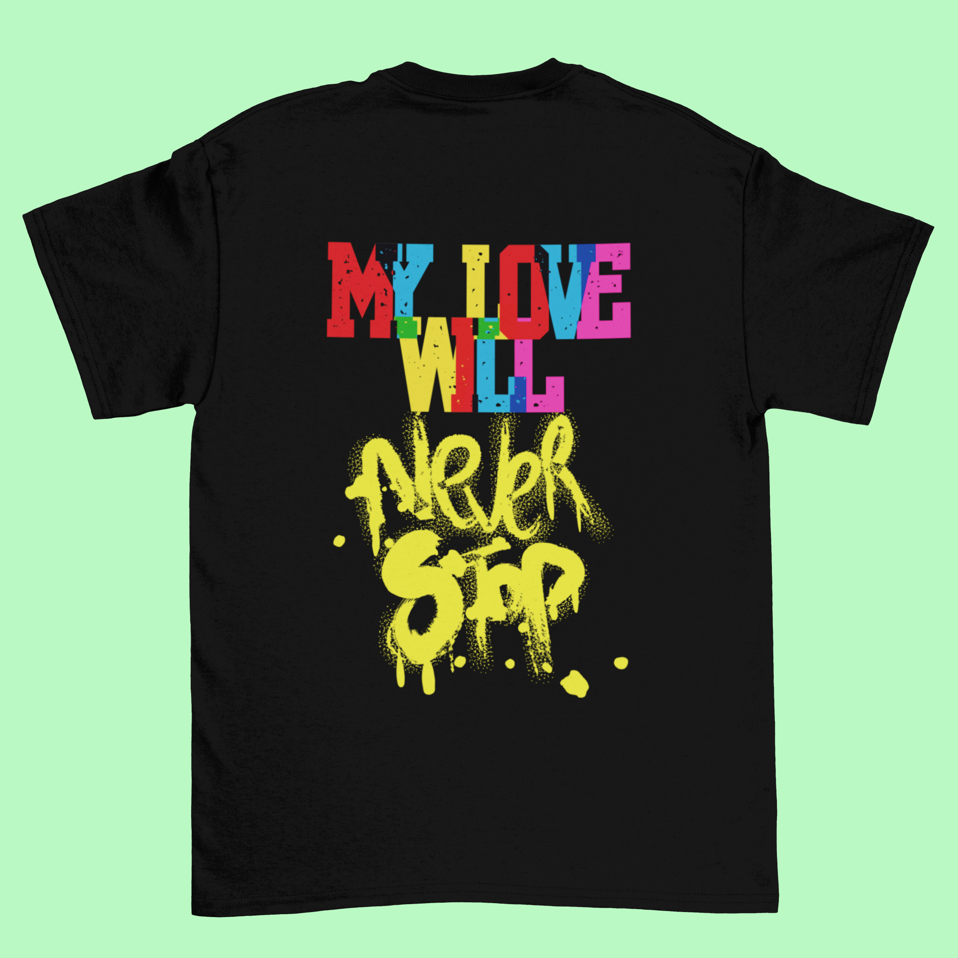 Liefde met power! Dit zwarte T-shirt combineert felle kleuren met een urban touch. De tekst MY LOVE WILL is gedrukt in een speels kleurenpalet, terwijl NEVER STOP in gele graffiti-stijl op de rug spat – letterlijk en figuurlijk.