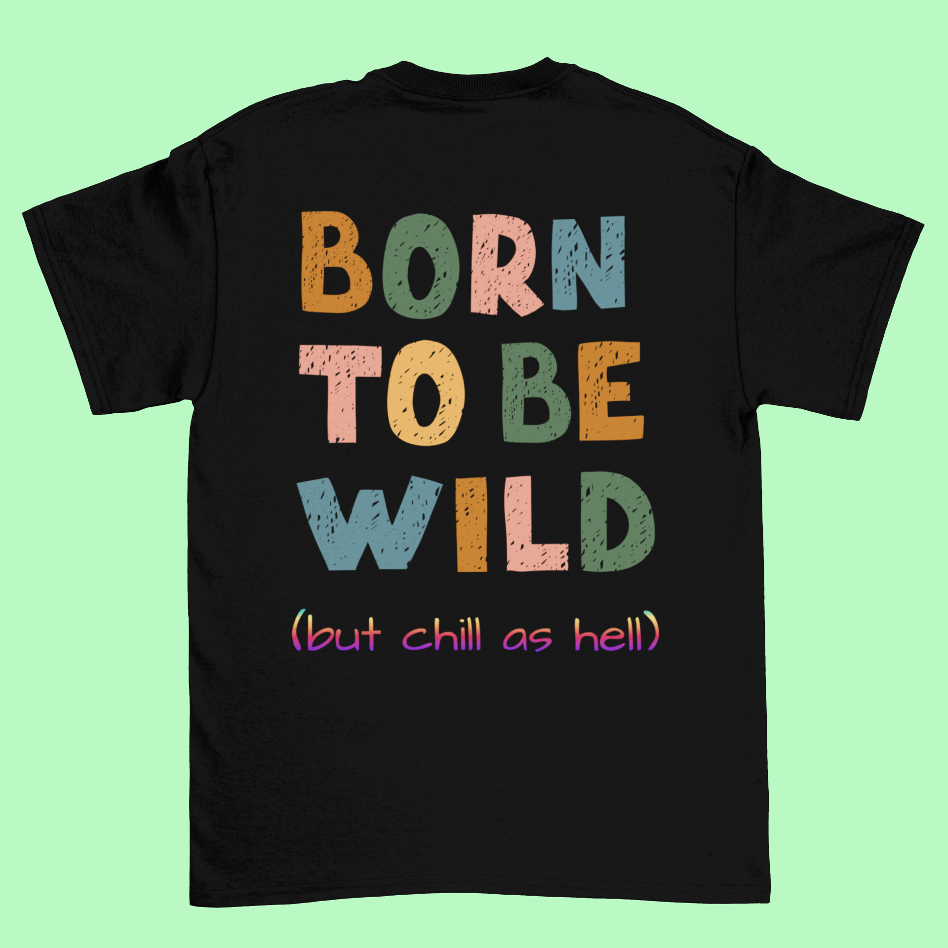 Voor iedereen die wild in het hart is, maar chill in de uitvoering. Dit zwarte T-shirt combineert een speels kleurgebruik met een relaxte attitude. De tekst “BORN TO BE WILD” springt eruit in grote, vrolijk gekleurde letters, met daaronder de knipoog: (but chill as hell).