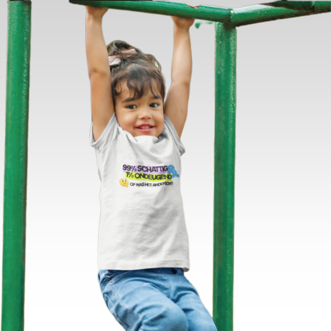 Een wit T-shirt met de ondeugende tekst "99% ondeugend 1% schattig" – perfect voor kids met pit en charme!