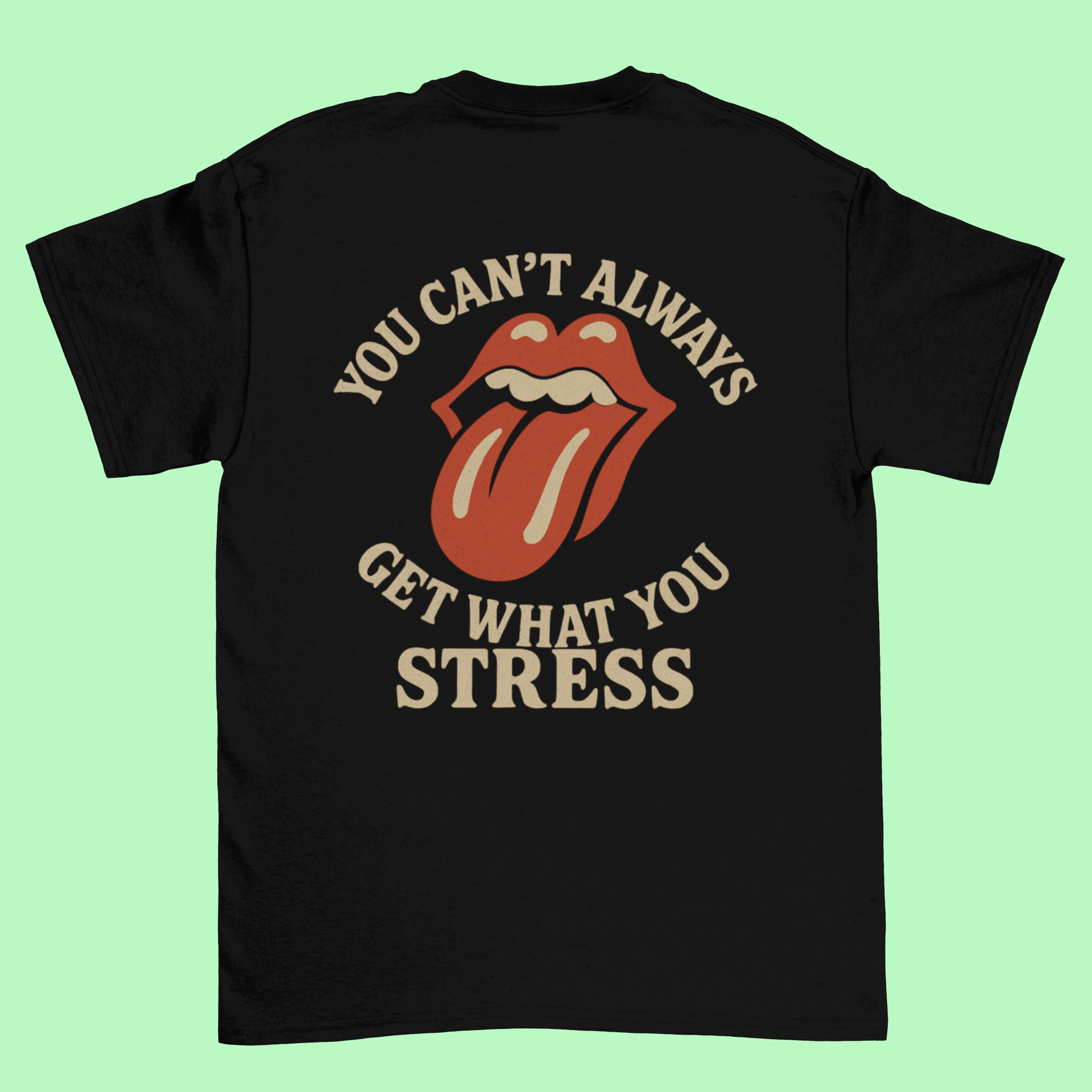 Een knipoog naar een klassieker – maar dan met een relaxte twist. Dit zwarte T-shirt met vintage rockstijl en speelse tong-illustratie zegt precies wat jij denkt: stressen helpt niet altijd.