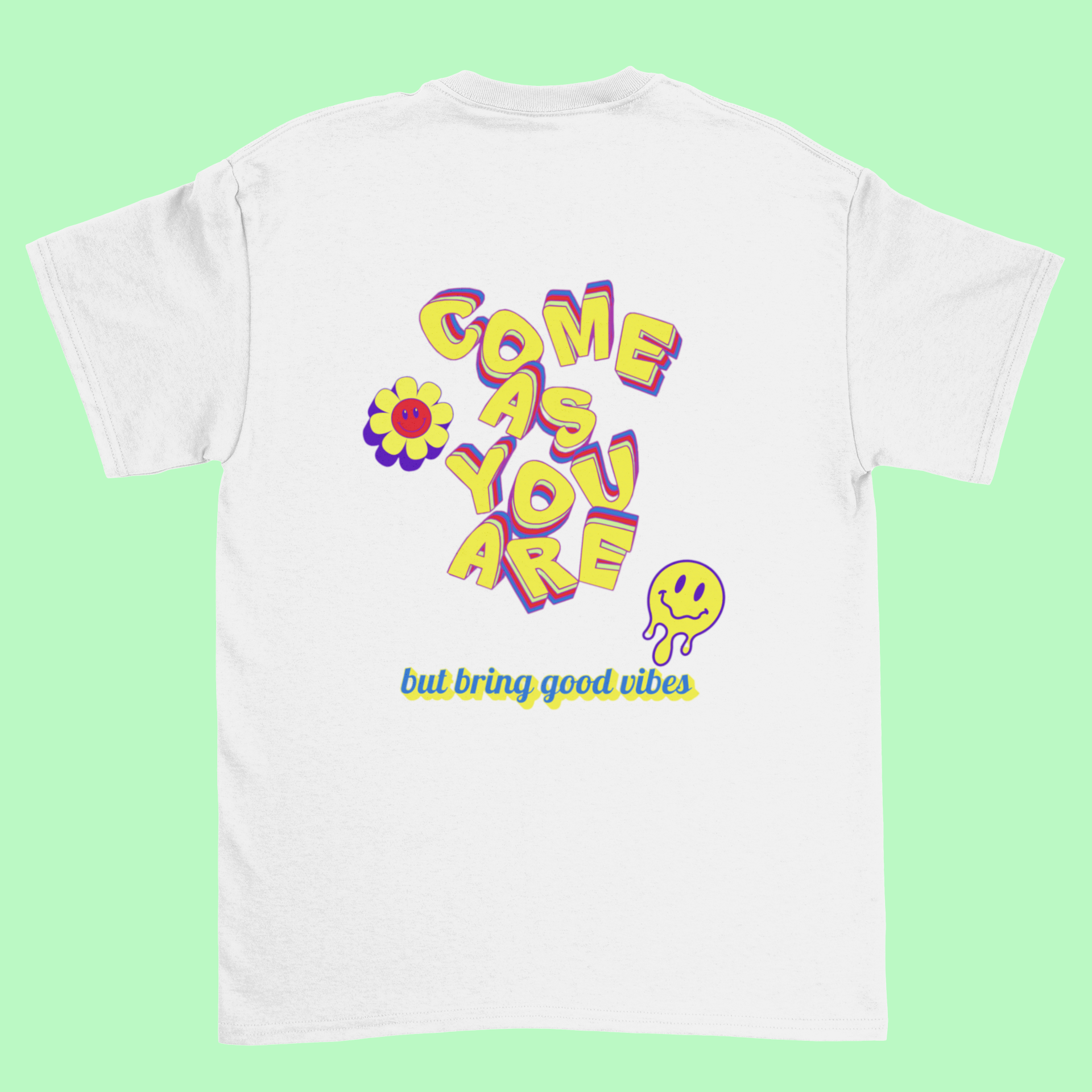 Wees jezelf – maar vergeet de goede vibes niet! Dit witte T-shirt straalt vrolijkheid en positiviteit uit met zijn speelse paarse-geel-roze tekst, bloemenprint en een lachend smiley-ijsje. Perfect voor iedereen die houdt van kleur, vrijheid en een fijne sfeer.