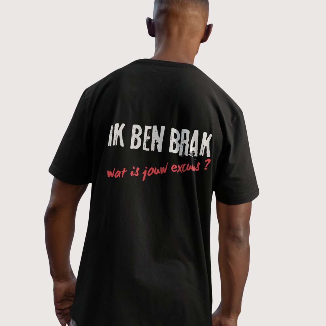 Ik ben brak – wat is jouw excuus? Dit T-shirt zegt precies hoe je je voelt, met een flinke dosis zelfspot.