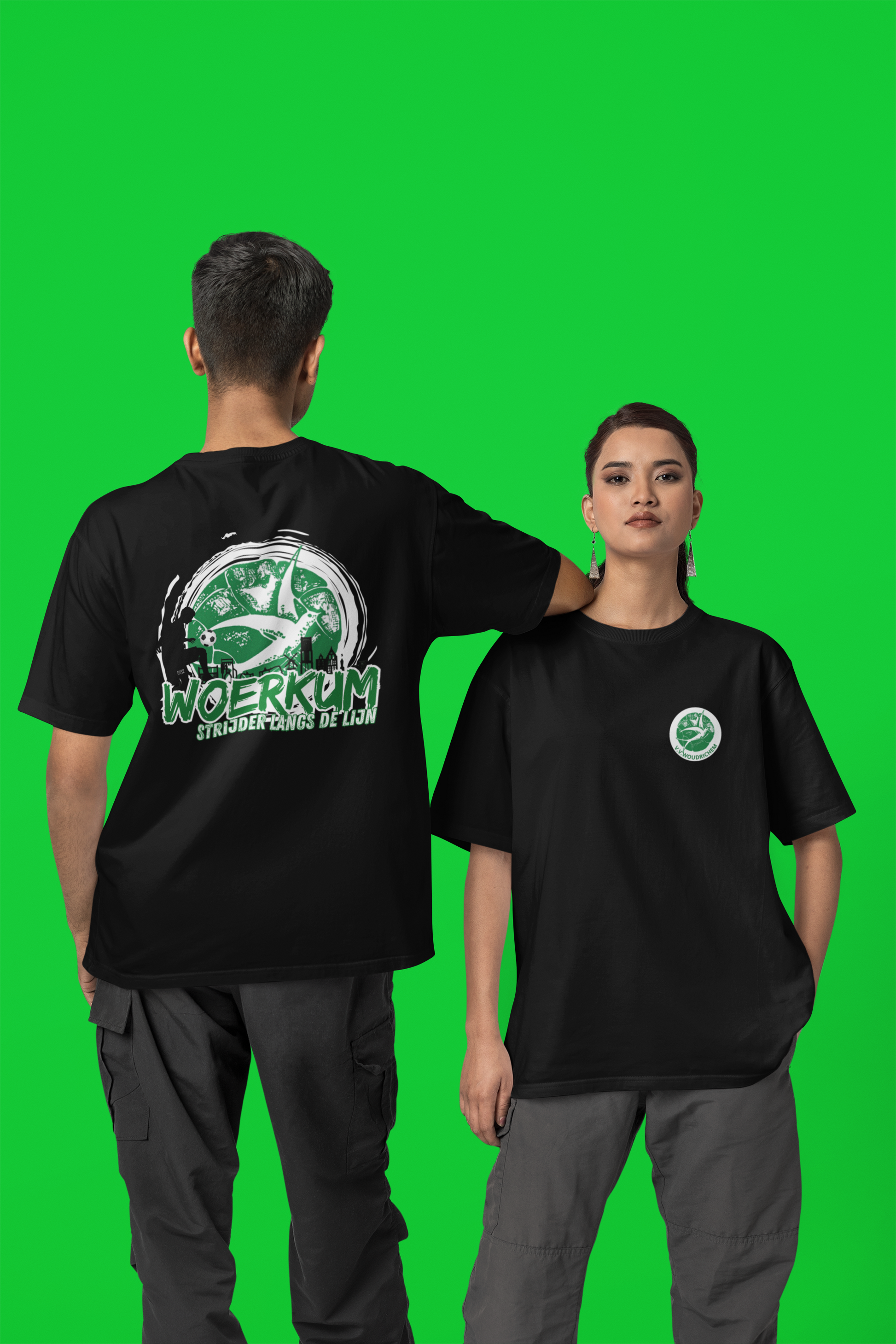 De achterkant toont een krachtige illustratie van Woerkum, met herkenbare iconen en de tekst "Strijder langs de lijn". Op de voorkant prijkt een subtiel embleem op de borst – een eerbetoon aan jouw support langs de lijn, op het plein of in het café.