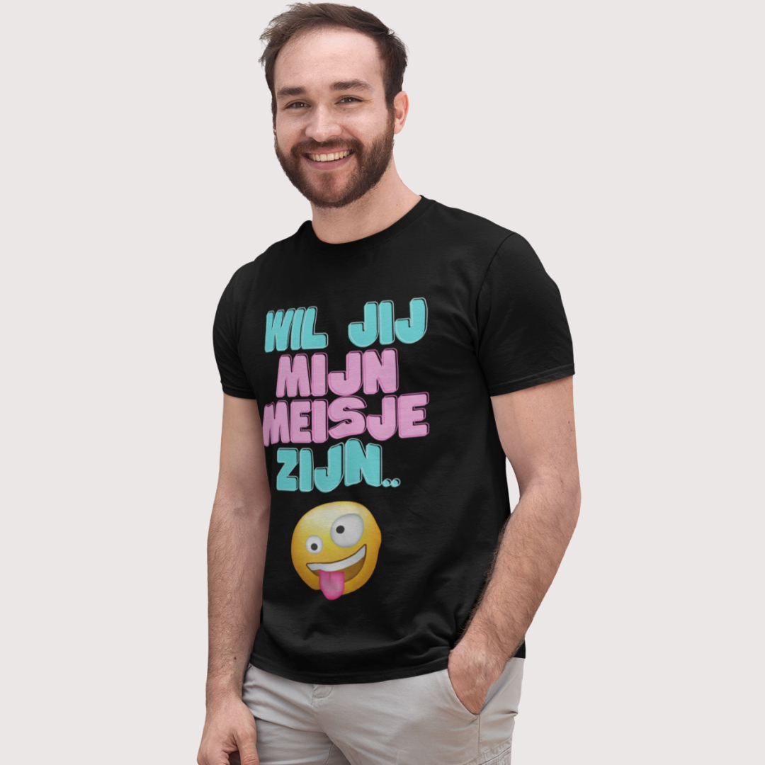 Speels zwart T-shirt met kleurrijke opdruk in roze en blauw: "WIL JIJ MIJN MEISJE ZIJN.." inclusief een grote emoji met tong uit de mond. Een knipoog naar jonge liefde, humor en zelfspot – ideaal om iemand met een glimlach te verrassen (of het ijs te breken!).